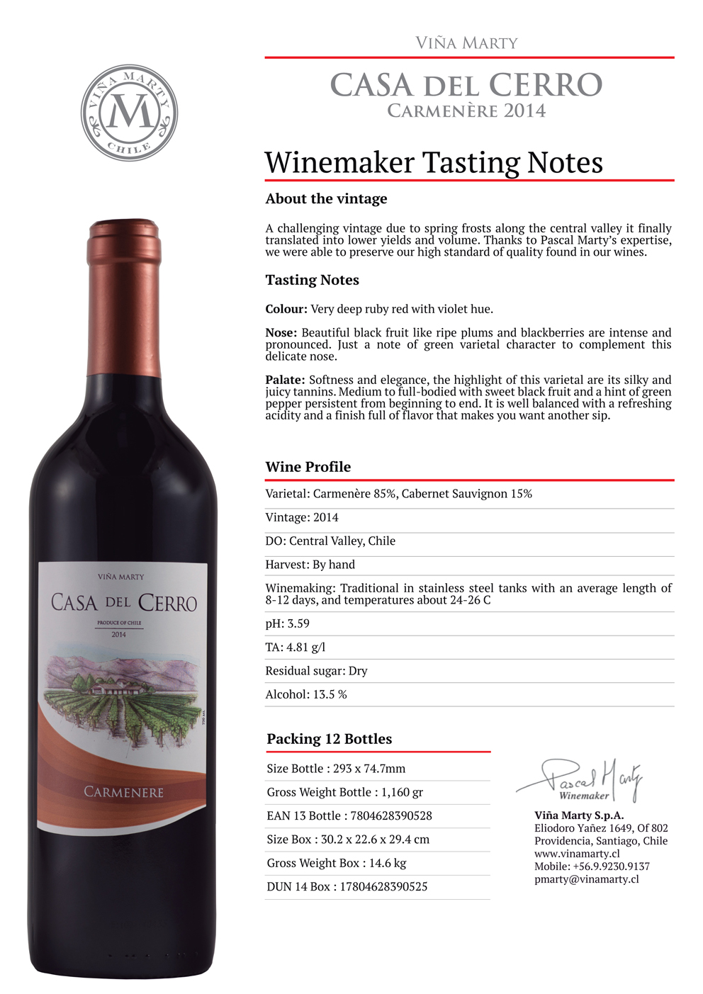 Casa del Cerro Estate wines are available in Cabernet Sauvignon, Carmenère, Merlot, Chardonnay, and Sauvignon Blanc.